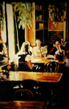 I tried to create the mood by not being too photorealistic, but more impressionistic. Jennifer, on the left, is reflected in the mirror to the left of her. Sarah checks out the menu, while Nicole enjoys visiting. I painted the window a whitish yellow and matched the same color in Jennifer’s hair, showing reflection. It continues down to the table below it. To the right on that table can be seen the reflection of the chair below it. Sarah and Nicole are lit up on their left side by the window with a shadow on the right. The painting shows the cozy warmth of being sisters together.