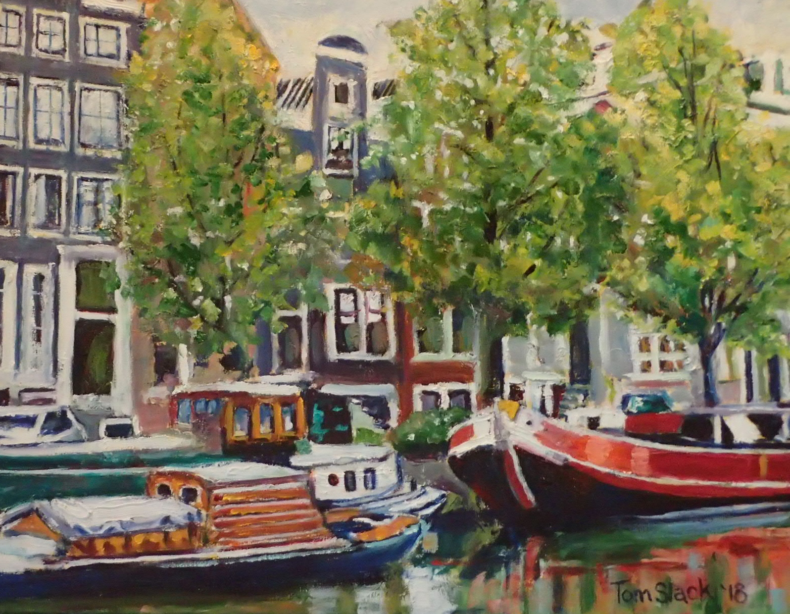 I had the opportunity to visit Amsterdam with my daughter who lived in Europe. I was enthralled with the beauty of that city — there are one hundred and sixty-nine canals that go through it. On each side are very tall, skinny buildings. Apparently the original owners were taxed by the square footage of their first floor, so they kept that floor small but had multiple stories. A lot of people live in house boats that float in the canals. Tall trees are on each side. The reflections of the houses, trees and boats are enchanting. Amsterdam is a beautiful city.