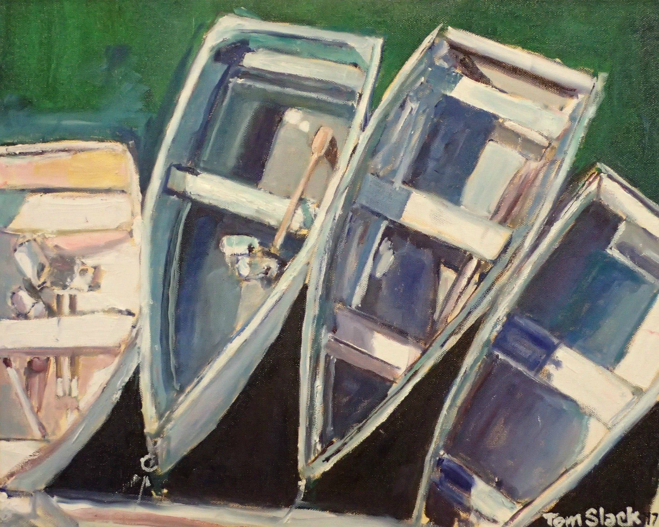 Another painting inspired by my recent trip to the New England Coast. This scene is from Rockport, Massachusetts looking down from the harbor wall at rowboats which are docked. I was intrigued by their repetition of shapes and the contrast between the dark water and the light boats.