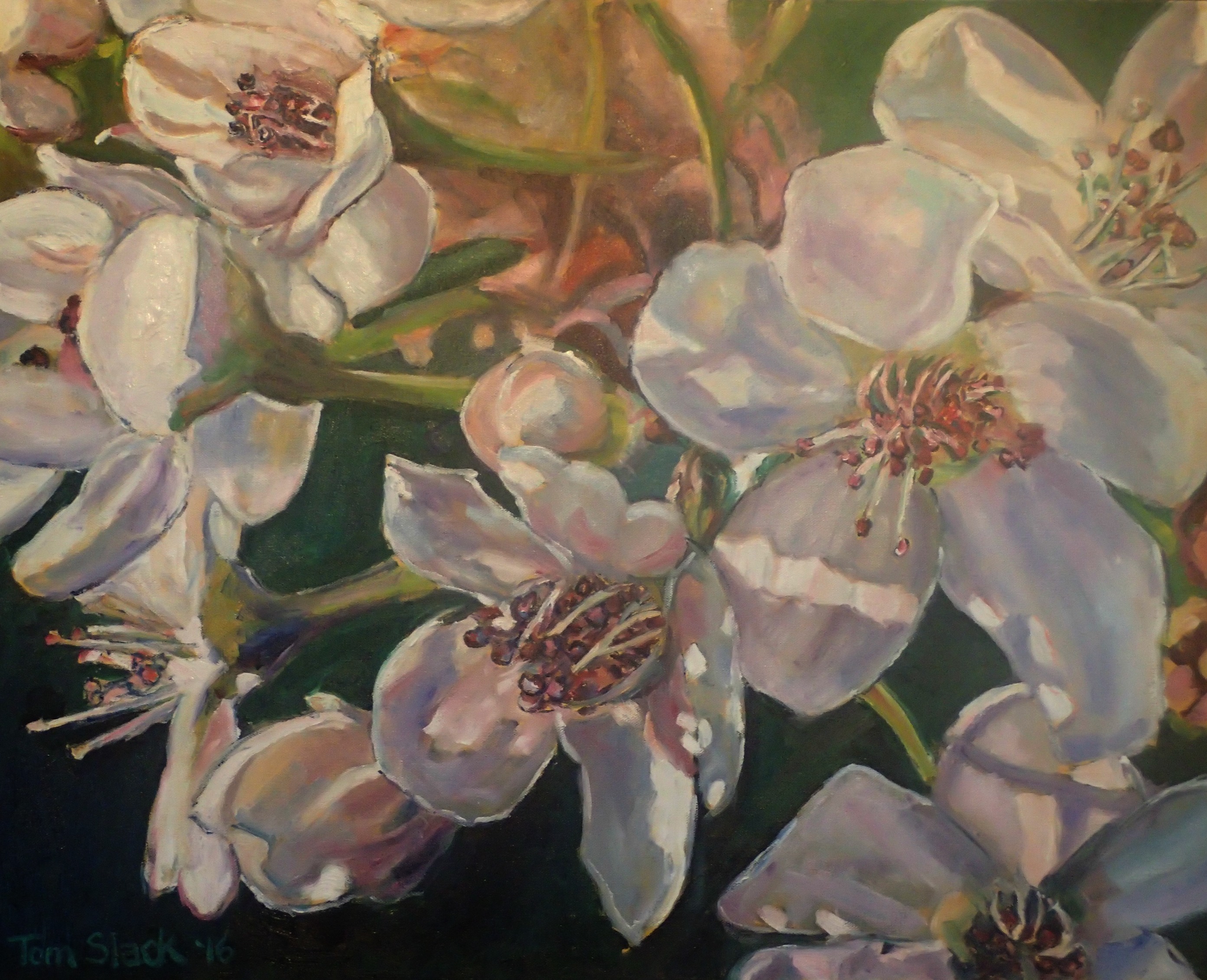 I have a Bradford Pear Tree in my front yard. Each spring it is covered with little white blossoms. I really hadn’t looked closely at them until this year. I was surprised at how complex and beautiful they were. I also was intrigued by the colors of the shadows and light on them so I decided to try to paint them.