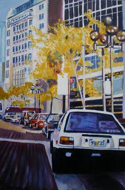 I love doing cityscapes!  I love painting cars!  This painting shows atmospheric and linear perspective.  The atmospheric perspective is shown by having a big car nearest us with detail while the cars further away are smaller and less detailed.  The same is true with the streetlights and trees.  The linear perspective is shown because the street is wider at the front and goes narrower the further you go.  Both types give depth to the painting.