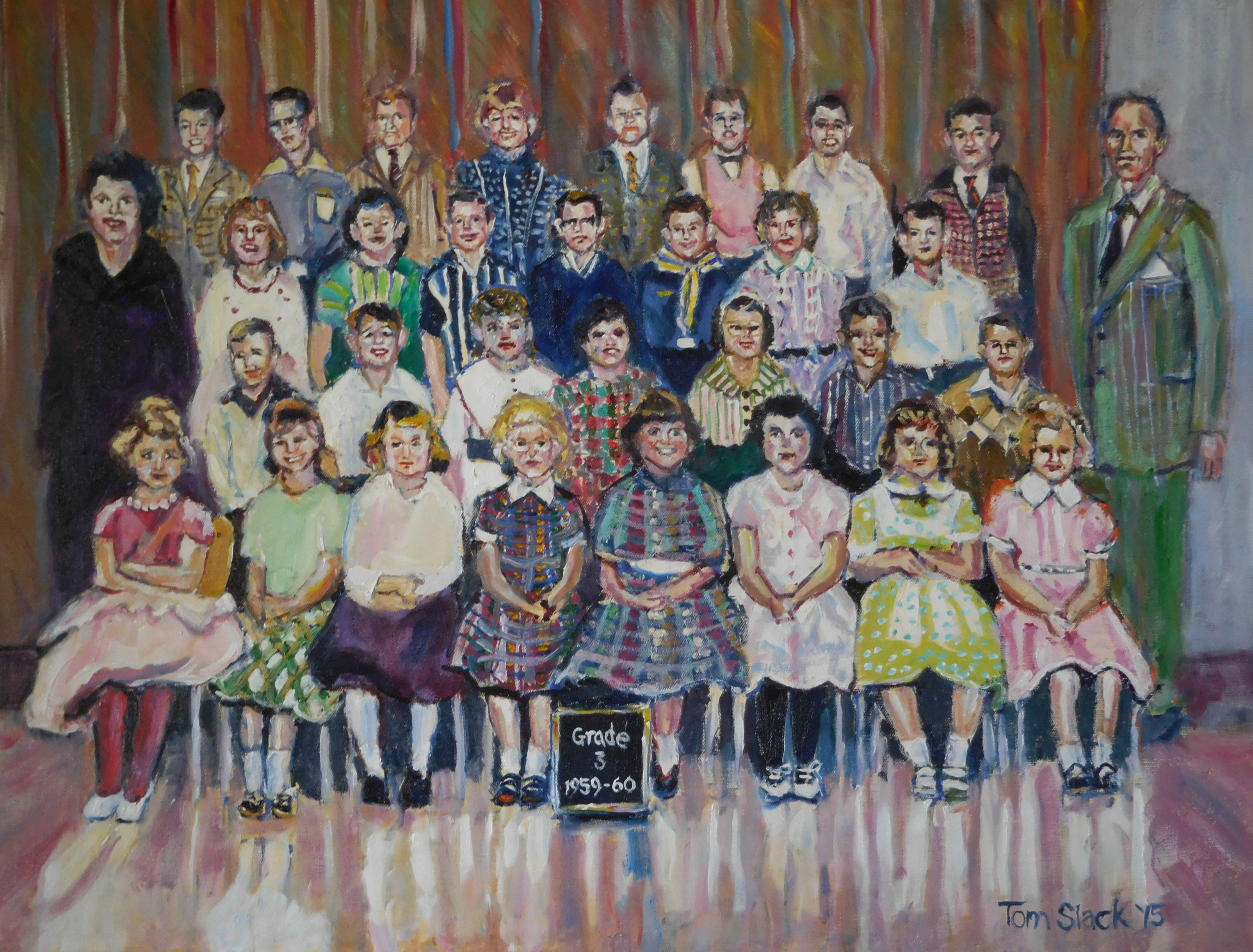 I found all of my school pictures from when I was growing up. As I looked at them, I realized the kids were small like my grandchildren. They were all innocent, unlike the way I remembered them. In my thoughts they were adults. The people in my pictures got to look forward to the Vietnam War, heartbreaks, divorce, murder and other things. Hopefully many of them have lived happy lives and enjoyed the fulfillment of family and friends. This painting shows how we dressed back then — the girls all were required to wear dresses every day to school. I enjoyed doing this painting. I hope my classmates are all happy.