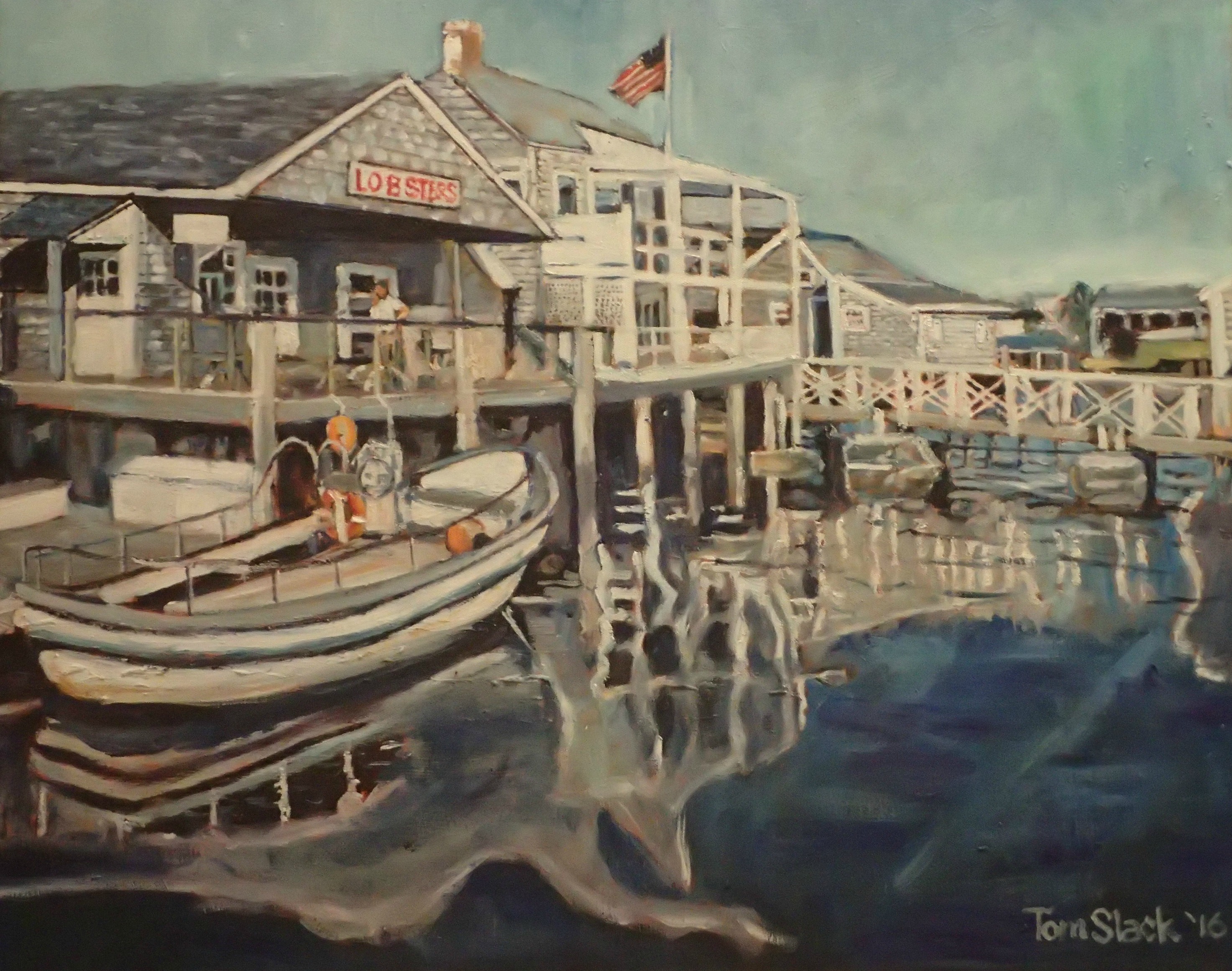 This is another painting that was inspired by my recent trip to New England. I absolutely adore Nantucket. There’s a magic there. The houses all have shaker shingles and the roads are brick. This painting shows a scene at the waterfront — shingled buildings and boats. New England is famous for lobsters, and this building is where you can get some. The water reflection is like a mirror except the lines wiggle back and forth because of the wave action.