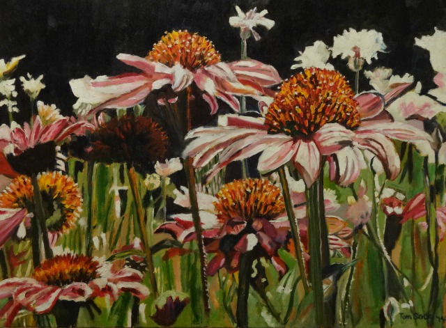 The use of contrast gives drama to the painting. The background is dark, the petals are light. I painted this as though I was at ground level rather than looking down from above.