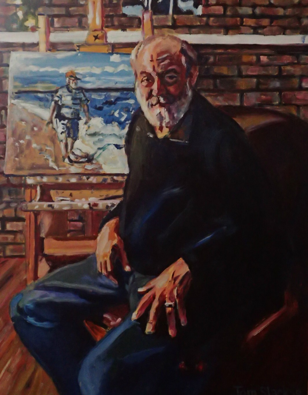 A few years ago my wife suggested I do as Rembrandt or Frida Kalhlo did — paint annual self-portraits. The first four were just my face. Last year I was sitting in a chair, sketching. This time I wanted to do one showing me as I am — an artist. Prior to this one I concentrated more on doing a perfect representation. This time I painted with emotion instead. What is represented here is how I really feel about myself.