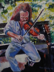 I went to Georgia to visit my son. We had fun playing on the beach at Tybee Island. We ate at a great restaurant in Savannah. I really enjoyed walking through town. Savannah has town squares about every block or two. As we walked through one of them, I was intrigued by a violinist who was sitting on a park bench. I could tell he loved his music. I painted this in honor of my friend Hunter Haskell.